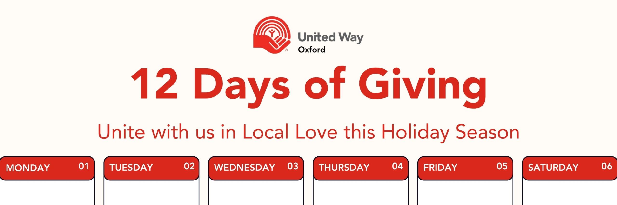 Join us from December 1 – 12 as we share a variety of creative ways to give back to your community and directly support those in need. We’ll offer opportunities to learn more about our community needs, share in ways to make someone’s day a little better, and donate to directly support local organizations, and people, in our community through United Way!